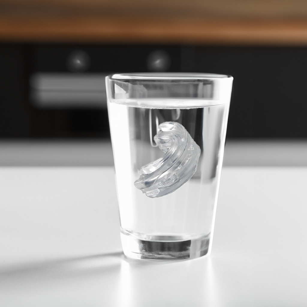Boil the snore device in water to soften the silicone. Once softened, place the device on your teeth and mold it to form a comfortable shape. Allow the device to cool and set into the customized shape. Clean the snore guard regularly and store it in the provided reusable hygienic case when not in use.