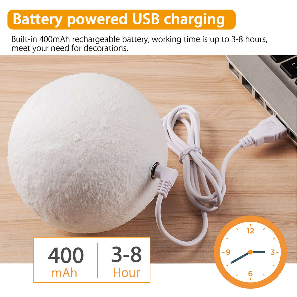 This moon lamp is cold and safe for everyone as it brights with an up to 1.5W LED Light, not only that but it can work perfectly for up to 8 hours with a single charge depending on the color and brightness of the light.