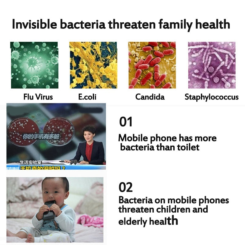 3. Portable Sterilizer-Our phone sterilizers are stylish, ergonomic and compact design, so you can take them with you wherever you are. In particular, this mobile phone sterilizer is powered by a laptop desktop mobile power USB charger, and you can use your phone case to sterilize your phone, whether on the go or on the go.