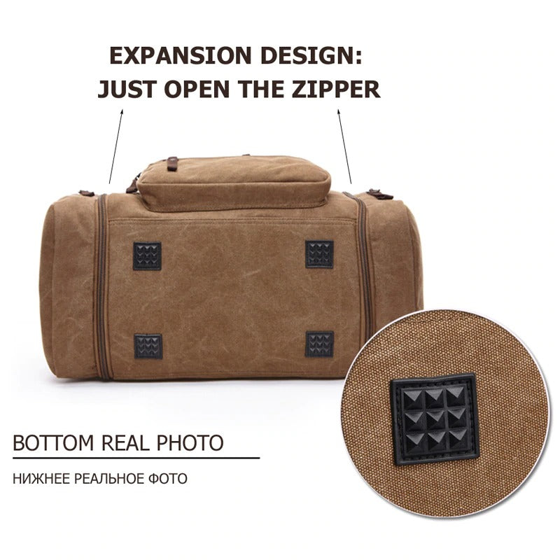This canvas duffle bag comes with expansion zippers on the sides to expand the duffle bag, so you have that extra space you need to keep your things. And 4 plastic anti-slip bases so you won't damage the fabric when you place your duffle bag on the floor. Perfect for traveling with your clothes, your laptop, an extra pair of shoes, some notebooks, office products and so much more.